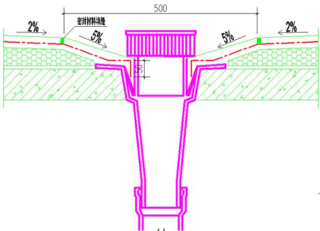 主楼屋面水落口:出屋面的雨水口在屋面防水保护层施工时候,此区域500范围内的刚性防水保护层提前施工,此区域内500范围内四周提前预埋定型化模板框(定型化模板块采用模板条制作)。使雨水口500*500区域刚性保护层与四周分开,此区域内找坡坡度按5%施工,其余区域找坡按2%向雨水口找坡施工。