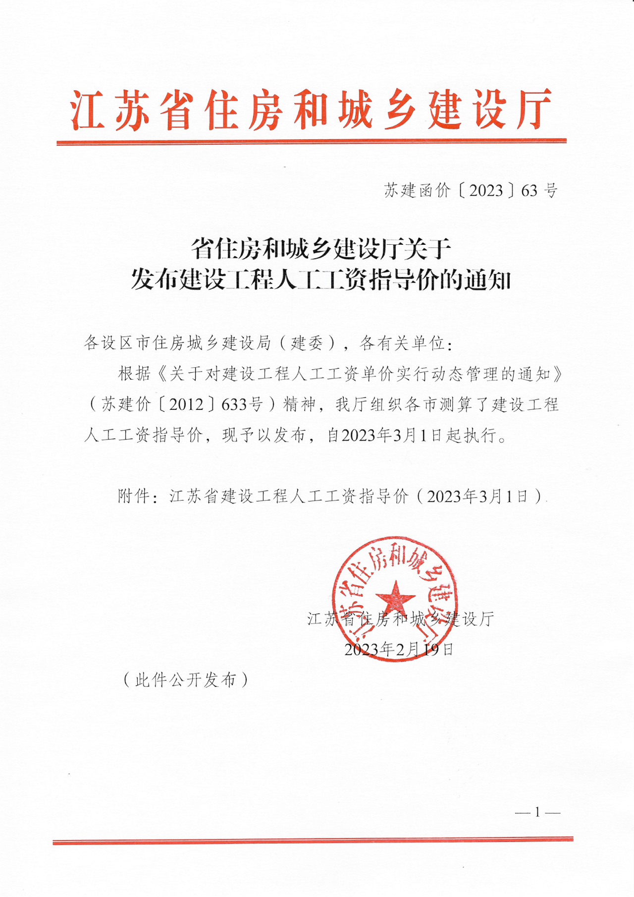 根据《关于对建设工程人工工资单价实行动态管理的通知》(苏建价〔2012〕633号)精神,我厅组织各市测算了建设工程人工工资指导价,现予以发布,自2023年3月1日起执行。