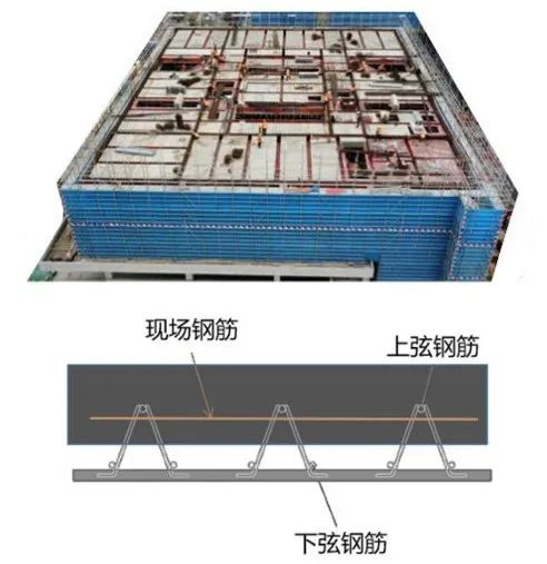 免拆底模钢筋桁架楼承板是由钢筋桁架和混凝土底模组成一体化的组合楼承板,施工阶段由钢筋桁架和混凝土底模形成整体模板支撑体系,能够承受湿混凝土及施工荷载;楼板混凝土浇筑完成后钢筋桁架作为楼板使用阶段的受力钢筋,承受使用阶段荷载,且混凝土底模免拆卸,楼板底部不需要抹灰找平,可以直接装饰装修,大大节省了施工时间和综合造价。
