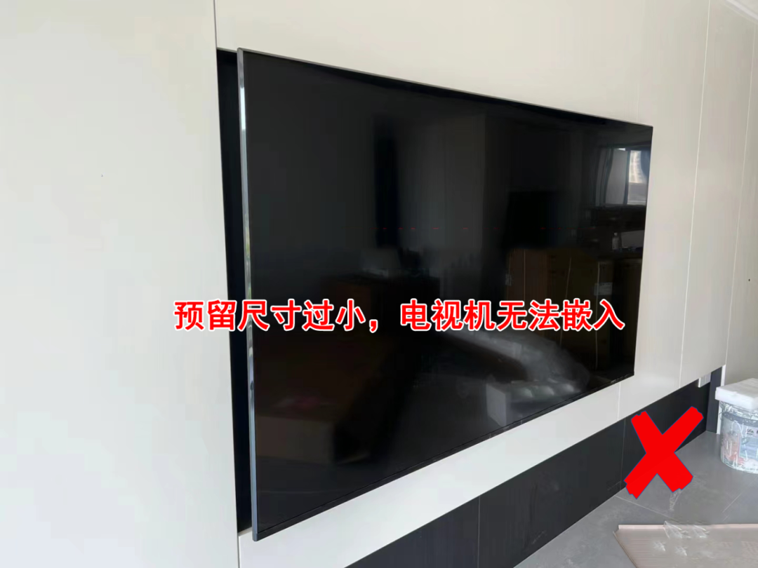 但安装时大多会出现预留过大不美观,预留过窄难安装的情况。为避免上面的情况,业主需要根据空间尺寸提前看好相关品牌电视机尺寸给到设计师与施工人员进行设计与施工。