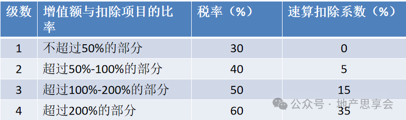 1.2.5.2增值额、适用税率及速算扣除系数 1.增值额=除税销售收入-可扣除项目总计金额;2.适用税率及速算扣除系数: