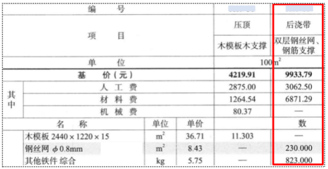 很多省市的定额,后浇带模板考虑的内容与实际有很大的差异。某省的2020新定额,后浇带混凝土的拦截考虑的是双层钢丝网加钢筋支撑(铁件),较接近于施工实际。(下定额截图)