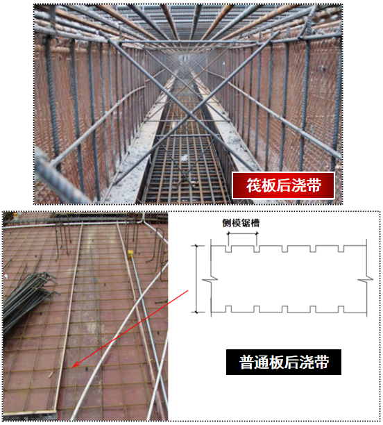 3、一些厚度不厚的板、断面不大的梁的后浇带,因侧压力小,无需双层网,用单层小丝网即可。有的板的后浇带不用铁丝网拦截,而是用侧模锯槽的方法。一定厚度的筏板与普通的板、墙、梁,钢筋支撑用量差异很大,十几公分厚的板与厚大的筏板,钢筋支撑的用量不可同日而语(下图)。所以,不区分构件,都是同一水平,定额似乎不尽合理。