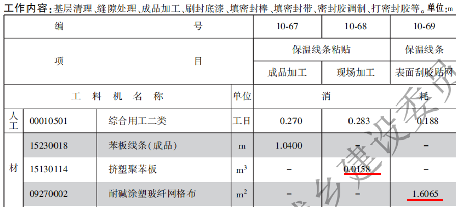 很多省市的定额有相关的外墙聚苯板的线条子目,一般分成品和现场制作两种,且计量单位都是延长米。如:河北的B6-103~B6-106;四川的AK0098~AK0101;北京的10-67~10-69…