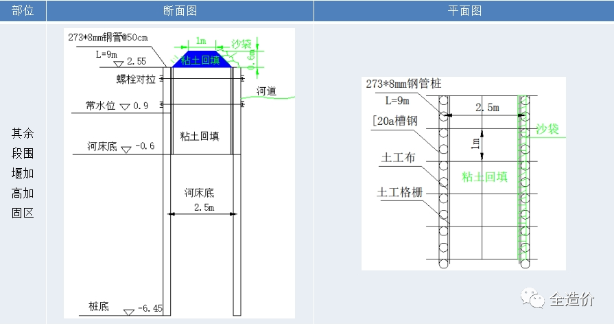 其余段围堰加高加固区:检查并修复破损土工布及土工格栅,在原围堰上直接培土加高0.6m,即顶高程控制在3.15,围堰顶土宽1m,坡度1:1,并在围堰迎水侧一面码放沙袋,防止浪涌冲刷。