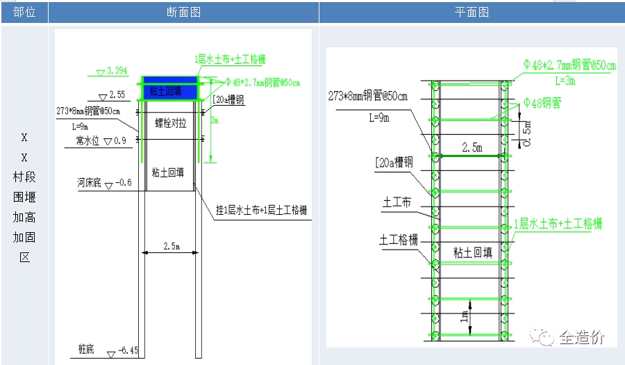 XX村围堰加高加固段:在原围堰φ273钢管桩上方插入3m长φ48钢管,钢管桩顶标高控制在3.394,挂土工布和土工格栅,中间填土,钢管横向、纵向均采用2道长φ48钢管固定。为防止浪涌冲刷,在围堰顶覆盖土工布。