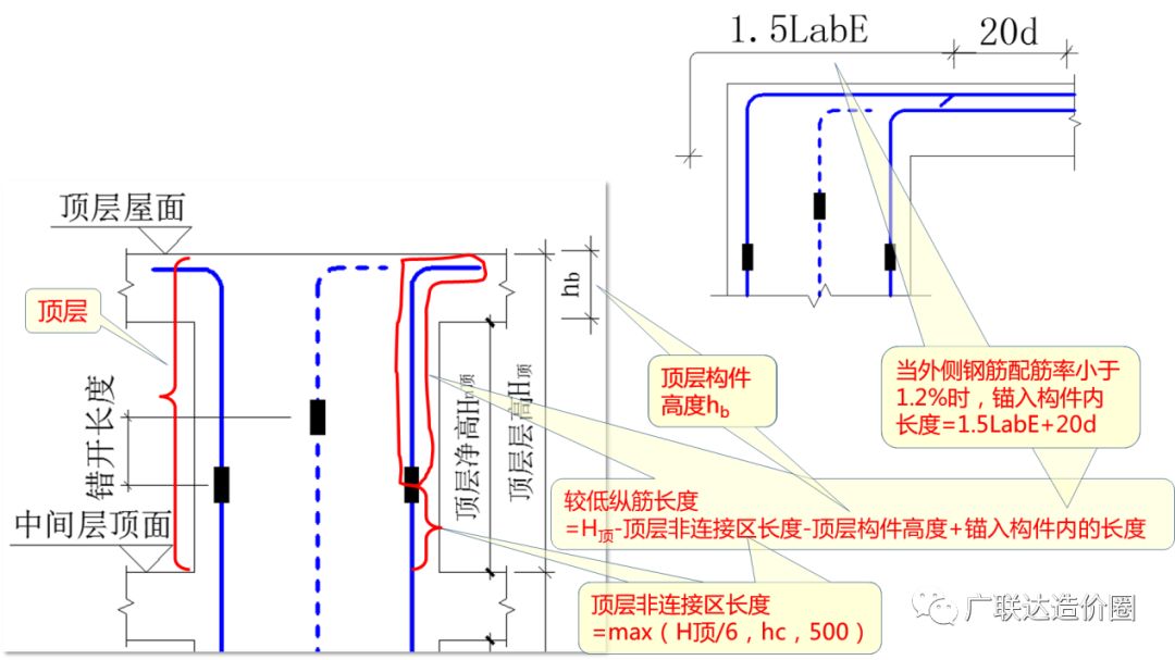 图1:平法图集16G101-167页内容 68页的内容如图2所示。 图2:平法图集16G101-1 68页内容 如果大家看不清楚,可以打开图集翻到这两页,边看图集边读文章,可以更好地理解。 不同部位的柱,到顶层纵筋的算法各不相同。要想搞清楚顶层柱纵筋计算原理,我们首先要搞清楚什么是角柱、什么是边柱、什么是中柱,同时还要搞清楚什么是内侧纵筋,什么是外侧纵筋。 什么是角柱、边柱、中柱? 图集根据柱子不同的受力情况(偏心受压、轴心受压),给出了角柱、边柱、中柱不同的配筋。这三个概念必须弄清楚才行,我根据自己的经验给出了较为通俗易懂的定义。如果大家觉得不妥,可以在文章后留言,我们共同探讨。 柱子与梁的位置关系(即受力不同)决定了什么是角柱、什么是边柱、什么是中柱。 两根梁形成L型相交,相交位置的柱就是角柱,两根梁形成丁字相交,相交位置的柱子就是边柱,两根梁形成十字相交,相交位置的柱子就是中柱,如图3所示。 图3 什么是内侧纵筋?什么是外侧纵筋? 内侧纵筋与外侧纵筋也是由柱与梁的相交关系决定的(即:偏心受压、轴心受压)。与梁相交的面属于内侧纵筋,不与梁相交的面属于外侧纵筋,按照这个定义,角柱两面是外侧纵筋,两面是内侧纵筋;边柱有一面是外侧纵筋,三面是内侧纵筋,中柱因为四面都与梁相交,全部是内侧纵筋,如图4所示。 图4 注意,内外侧筋相交的那根角筋算外侧纵筋。 认识了角柱、边柱、中柱以及它们的内侧纵筋和外侧纵筋,接下来我们来计算纵筋的长度,我们先从最简单的中柱开始计算。 中柱纵筋长度计算 从前面的知识我们可以了解到,中柱只有内侧纵筋。请大家翻开平法图集16G101-1的68页,我们先来看一下16G平法对中柱的内侧纵筋有什么规定。 (一)中柱的节点构造 平法图集关于中柱顶部构造有4个节点,下面我们一一讲解。 1、节点1:中柱纵筋向内弯折12d 节点1适用于顶部屋面板厚小于100的情况,由于板太薄,柱纵筋不宜锚入板内,只能向柱内弯折,如图5所示。 图5 并不是所有的纵筋都不能向柱外弯折,图5中伸入梁内部分的柱子纵筋,就可以向外弯折,这就是节点2要给大家讲的。 2、节点2:中柱纵筋向外弯折12d 节点2适用于顶部屋面板厚度大于100的情况,由于板厚大于100厚,柱纵筋可以向柱外伸入板内或梁内,如图6所示。 图6 3、节点3:中柱纵筋加锚头或锚板 中柱纵筋加锚头或者锚板,如图7所示。 图7 节点3很好理解,就是在钢筋头上加螺栓锚头或加一块钢板,以增加钢筋的锚固强度。 4、节点4:中柱纵筋到顶直锚 若柱子遇到顶部屋面梁比较高,且梁高大于锚固长度LaE,这时柱子纵筋必须直锚到顶,如图8所示。 图8 这里大家要注意,柱子纵筋伸入梁内尺寸只满足锚固长度是不行的,一定要伸到柱顶部。例如,如果柱子的纵筋是螺纹22的,锚固长度34d=34*22=748,梁高=900,这时候柱子纵筋伸入梁内的尺寸应该是900-30(保护层30)=870,而不是748。 这是因为在框架结构里,柱子承受梁的荷载,柱为主,梁为次,所以无论梁截面有多高,柱子钢筋一定要到的梁顶减保护层才行。 弄清了图集给的这些节点,接下来我们就可以计算中柱的顶部纵筋了。 (一)中柱纵筋长度计算 从以上图集给的节点分析中可知,中柱纵筋我们只计算两种情况就可以,节点1和节点2长度一样,都是到顶弯折12d,可以按弯锚来计算,节点3和节点4我们都按直锚来计算。 1、中柱纵筋弯锚长度计算 由于柱子纵筋不能在一个截面搭接,中柱纵筋就分为较低纵筋与较高纵筋,下面分别计算。 (1)较低纵筋长度计算 中柱弯锚情况较低纵筋长度计算如图9所示。 图9 (2)较高纵筋长度计算 中柱弯锚情况较高纵筋长度计算如图10所示。 图10 注意,这里d选用较大纵筋直径。 (3)软件里如何选择节点 中柱弯锚情况,在软件里选择节点一,操作步骤如图11所示。 图11 2、中柱纵筋直锚长度计算 前面我们已经知道了,中柱纵筋直锚情况,必须伸入到柱顶,长度也分为较低纵筋与较高纵筋,下面分别计算。 (1)较低纵筋长度计算 中柱直锚情况较低纵筋长度计算如图12所示。 图12 (2)较高纵筋长度计算 中柱直锚情况较高纵筋长度计算如图13所示。 图13 (3)软件里如何选择节点 中柱直锚情况,在软件里选择节点五,操作步骤如图14所示。 图14 边角柱纵筋长度计算 边角柱出现两种纵筋,一种是外侧纵筋,一种是内侧纵筋,内侧纵筋的算法,同前面讲的中柱计算,下面我们主要讲边角柱外侧纵筋的计算方法。 关于边角柱外侧纵筋,平法图集16G101-1的67给出了5种节点构造,下面我们一一解读这5个节点及其算法。 (一)节点1:柱外侧纵筋与梁顶部纵筋连为一体 节点1构造说的是:柱子外侧纵筋与梁顶部钢筋连成一体,如图15所示。 图15 这种情况设计上很少使用,施工上也不方便,所以很少出现,大家了解就行了。 如果你遇到这种情况,柱子纵筋就算至柱顶部减去保护层,与前面讲的中柱直锚算法一样,此处不再赘述。 (二)节点2:柱外侧筋与梁顶部筋相互搭接,且柱纵筋过柱另一边 节点2构造说的是:柱外侧纵筋与梁顶部纵筋相互搭接,搭接长度从梁底算起满足1.5LabE,且柱外侧筋到头过柱的另一边(注:这里LabE是基本锚固长度),如图16所示。 图16 图16柱子外侧纵筋的算法分两种情况:第一种情况是外侧纵筋的配筋率≤1.2%,另一种情况是外侧纵筋配筋率>1.2%,下面分别讲解。 关于外侧纵筋的配筋率,解释一下: 柱外侧纵筋的配筋率=柱外侧纵筋的截面