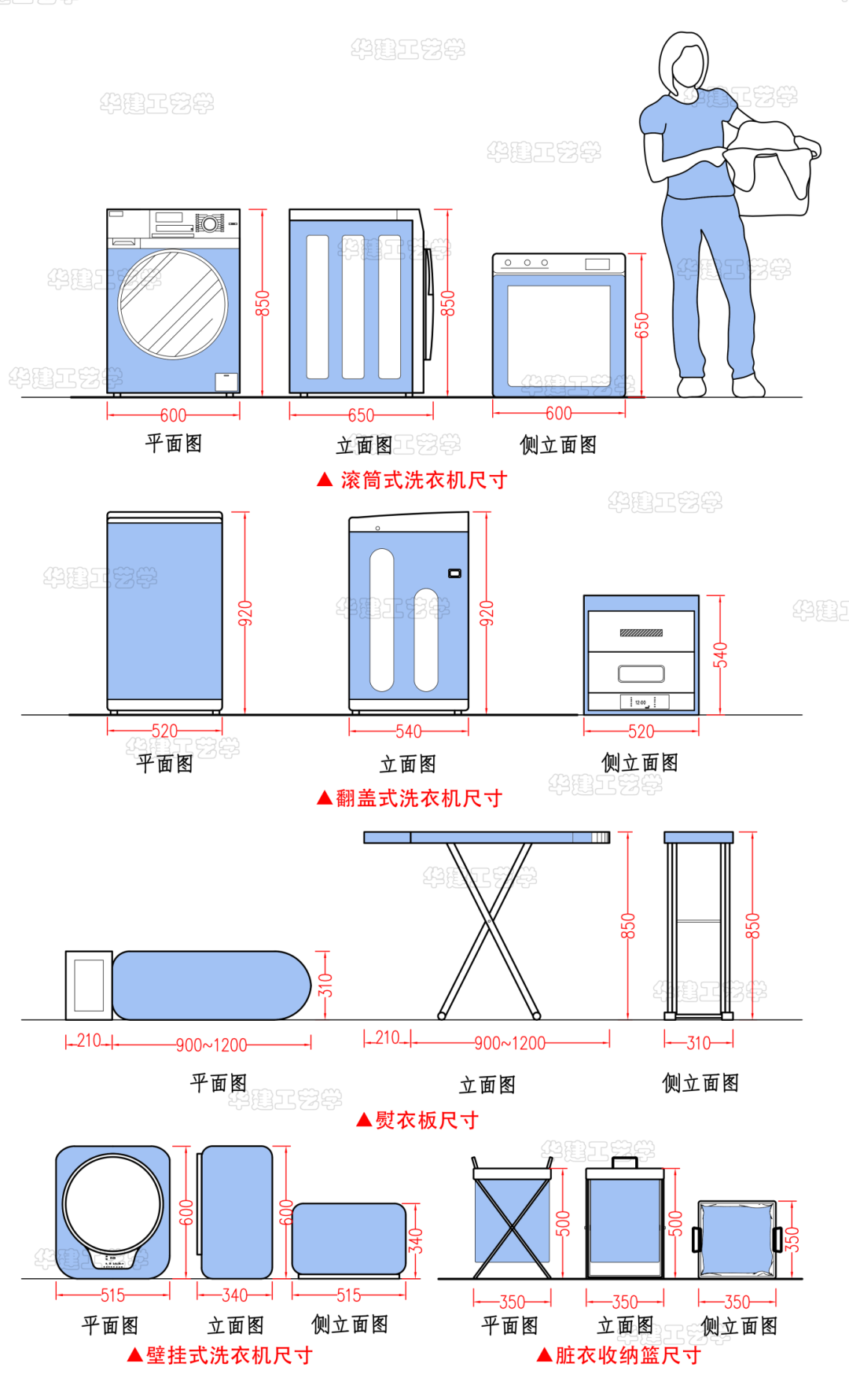根据人体工程尺寸和洗衣机的尺寸来规划洗衣柜的尺寸: