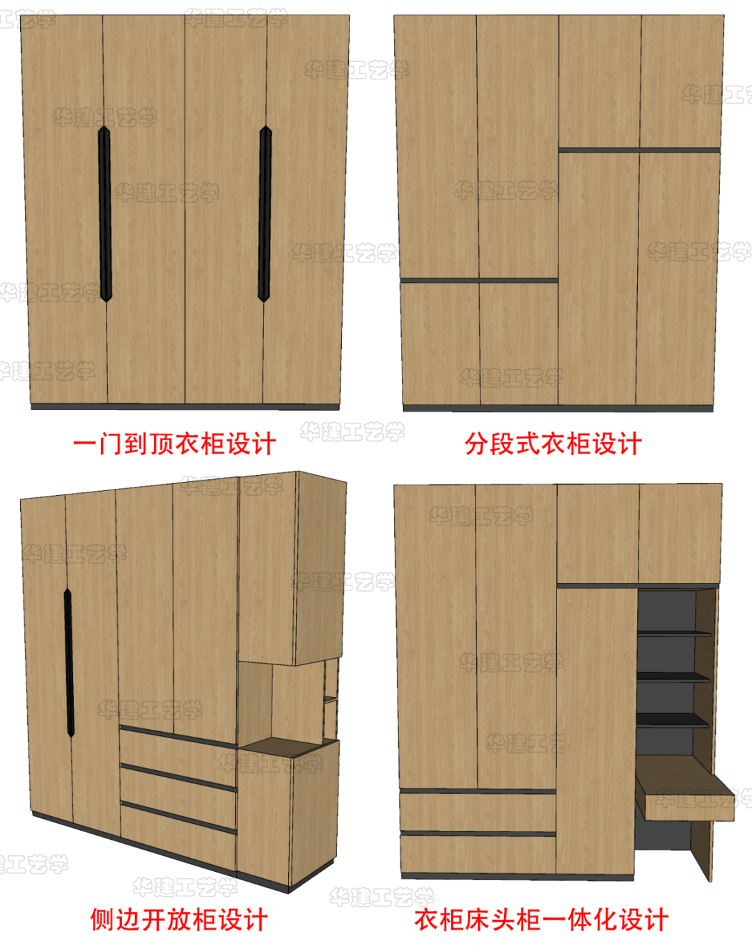 一门到顶衣柜设计、分段式衣柜设计、侧边开放柜设计、衣柜床头柜一体化设计等。