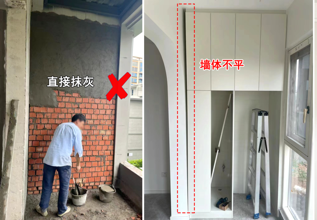 打灰饼需要提前一天方向、打点,等第二天干透后利用灰饼厚度进行磨平,由于需要提前一天施工,工人工作是按天计算的,所以好多工人今天开工就直接找平地面、墙面,跳过灰饼的施工工序,导致日后地面及墙面平整度不足。