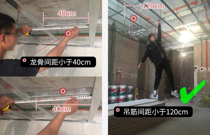 由于天花吊顶过多和过高,业主很少去仔细测量每个吊顶都龙骨之间的距离,而且后期面板翻盖上去也看不到了,所以有些龙骨排版超过了一些规范间距尺寸,但工人偷懒会少做一根,用肉眼很难去区分出来,导致后期吊顶龙骨密度不够,承受不了吊顶造型的重量,而下坠掉落。