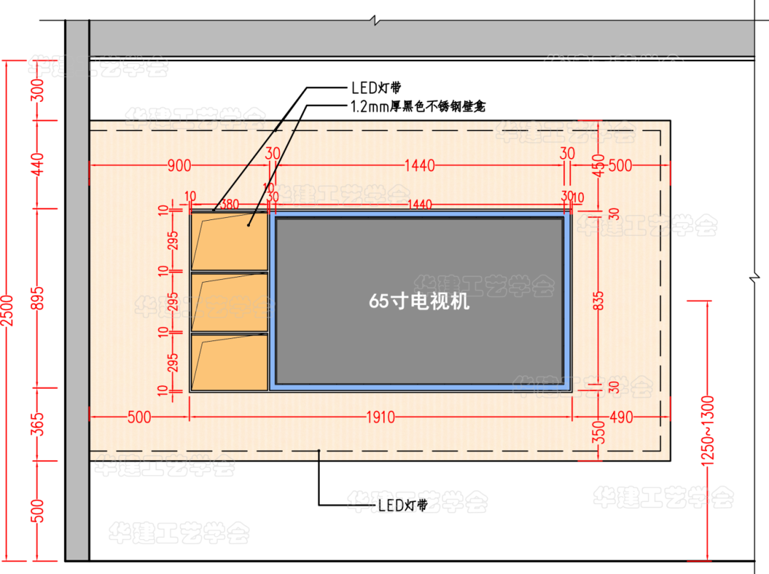 但安装时大多会出现预留过大不美观,预留过窄难安装的情况。为避免上面的情况,业主需要根据空间尺寸提前看好相关品牌电视机尺寸给到设计师与施工人员进行设计与施工。